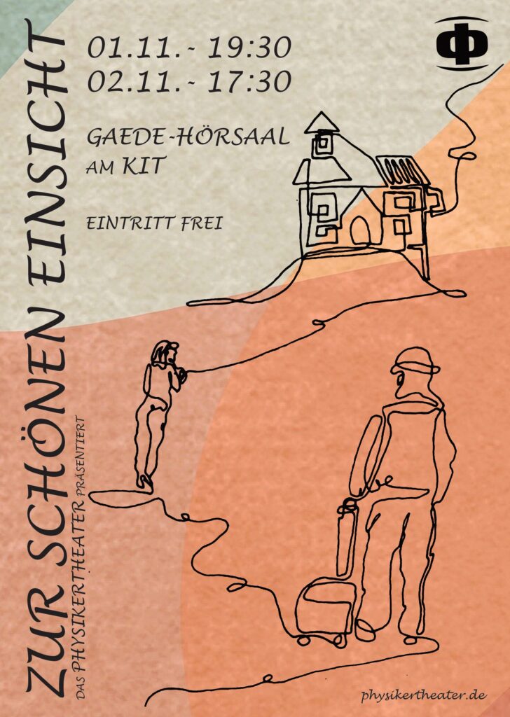 „Zur schönen Einsicht“ ist ein selbstgeschriebenes Stück des Physikertheaters, dass als Fortsetzung des Stücks „Zur schönen Aussicht“ von Ödön von Horváth entstanden ist. Dieses Stück haben wir in zwei Varianten aufgeführt, zunächst beim Z10 Sommerfest, am 26.06.2025. Erste Einblicke in die zweite Version des Stücks gab es im Rahmen der Theaternacht am 13.9.25 um 18 und 21 Uhr im Festsaal des KIT. Und schließlich folgte die zweite Aufführung am ersten Novemberwochenende.